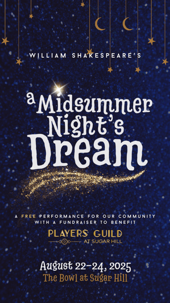 Get ready this summer for a journey of love, laughter, and lyrical brilliance as Players Guild and The City of Sugar Hill bring William Shakespeare’s beloved romantic comedy A Midsummer Night’s Dream to life in The Bowl.